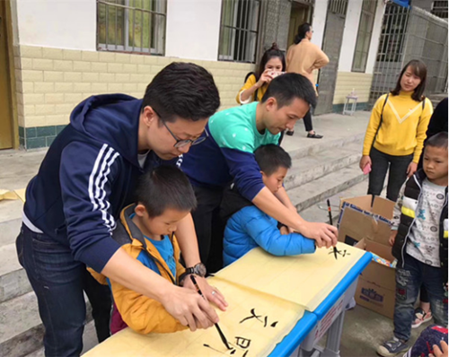 集團公司青年團干在游園活動中教學生寫毛筆字