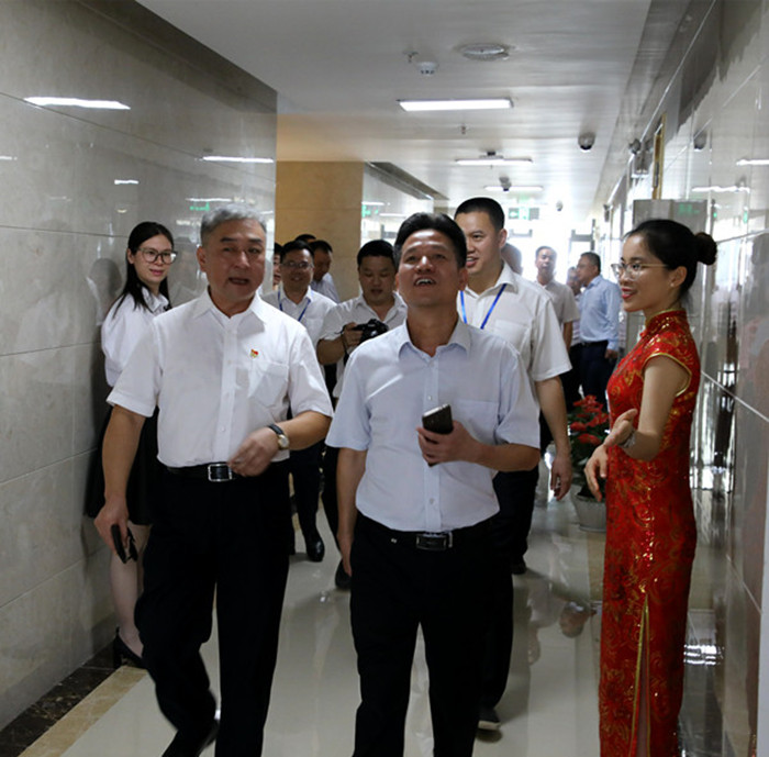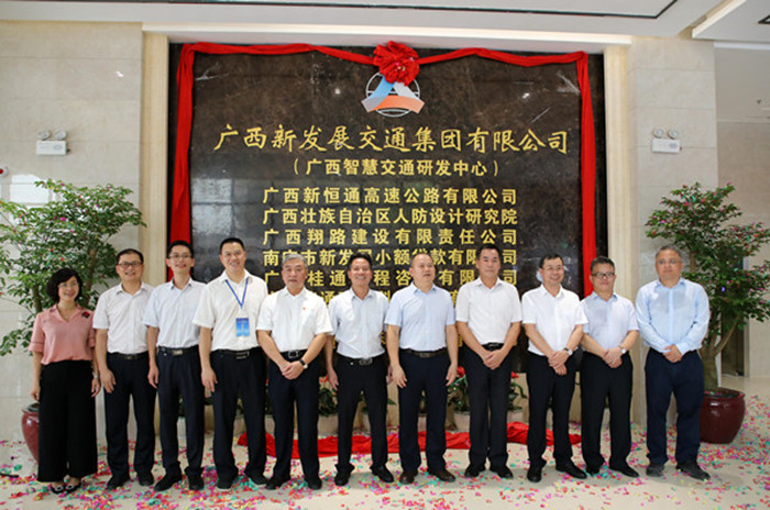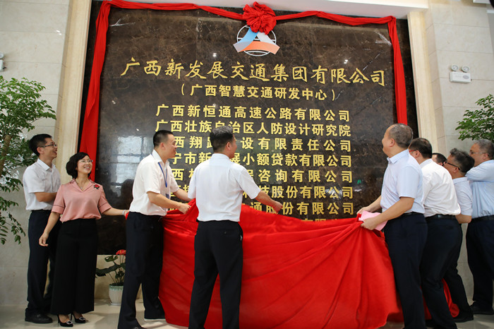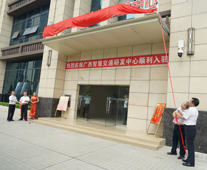 在喜慶熱烈的氣氛中,集團公司領導朱堅和、唐咸秋、翁科、韋慶和共同為廣西智慧交通研發中心暨入駐單位揭牌。儀式結束后,領導合影留念,并參觀了新辦公樓。