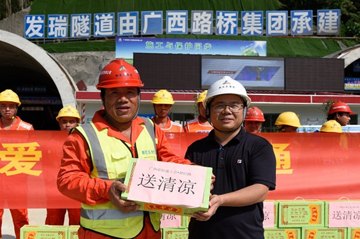 8月14-15日,新恒通公司黨委副書記、副董事長、總經理、總工程師藍日彥,公司黨委委員、常務副總經理蘇偉勝,公司黨委委員、副總經理、都巴高速指揮部黨支部書記、指揮長陸原恩一行到都巴高速五分部發瑞隧道出口、三分部紅水河特大橋施工現場,深入施工一線慰問都巴高速六個分部的一線工人,為他們送去了防暑降溫慰問品,表達了對一線工人的關懷,感謝他們炎炎夏日下的堅守。